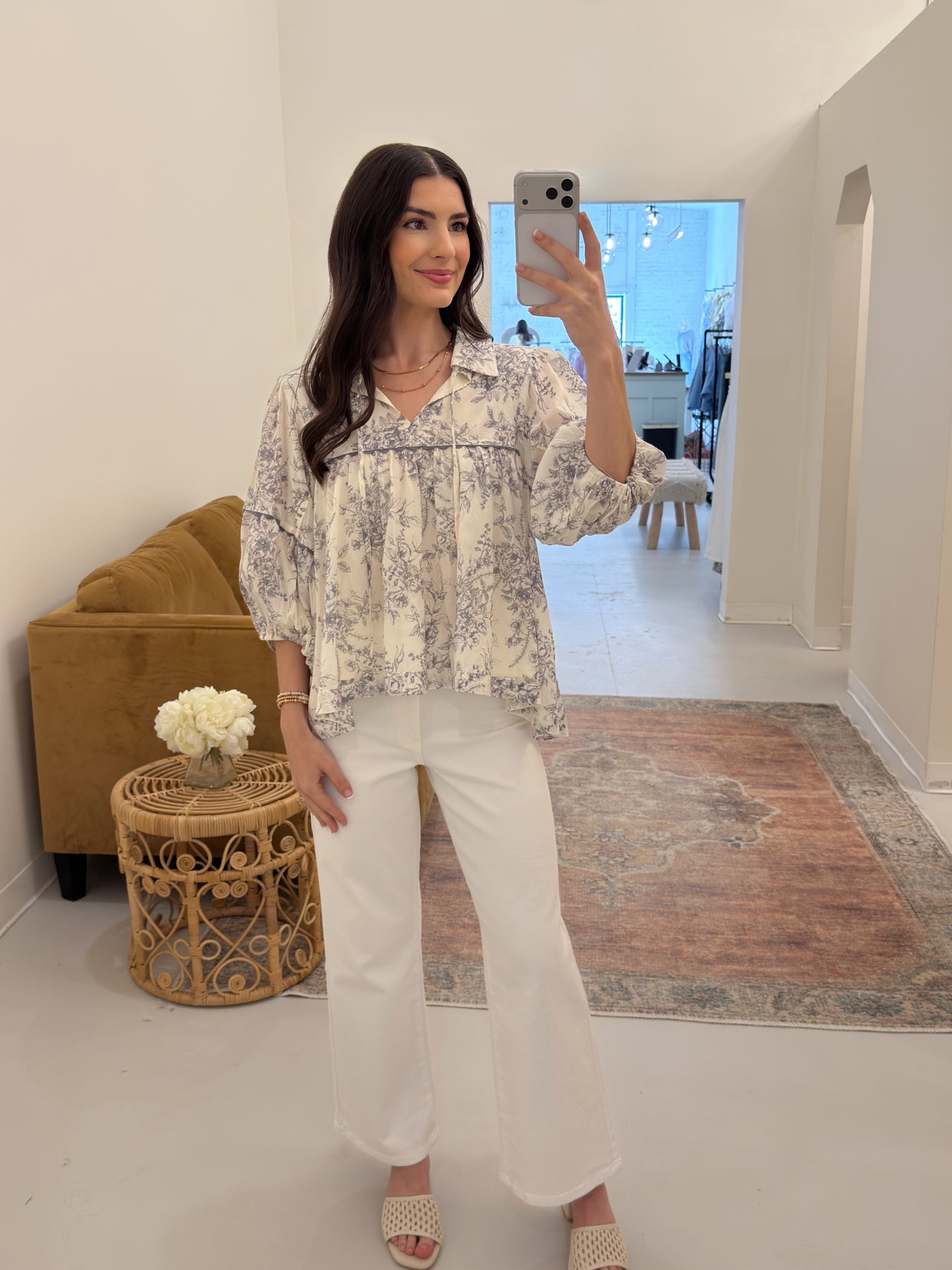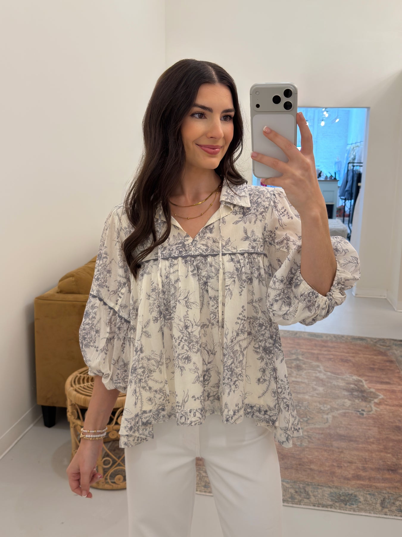 Floral Print Babydoll Top - Off White Charcoal
