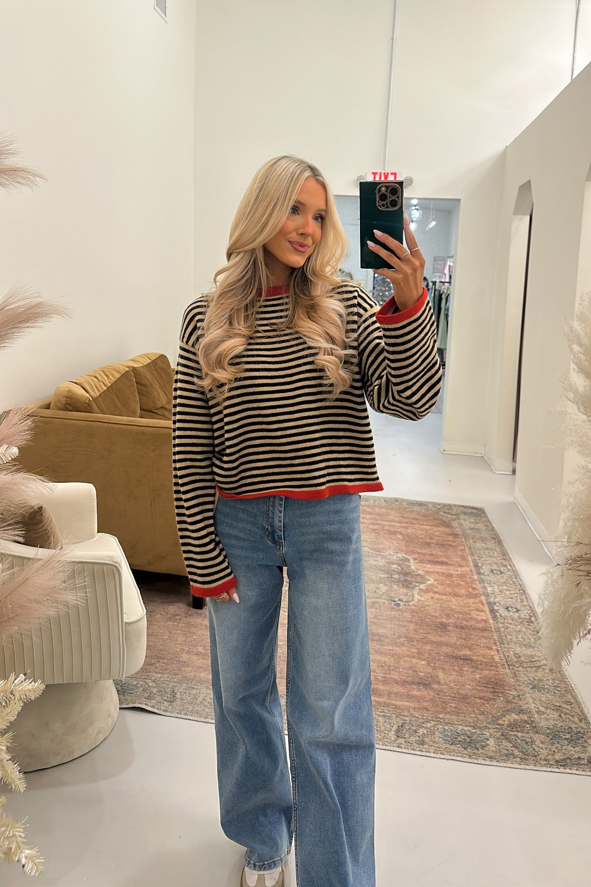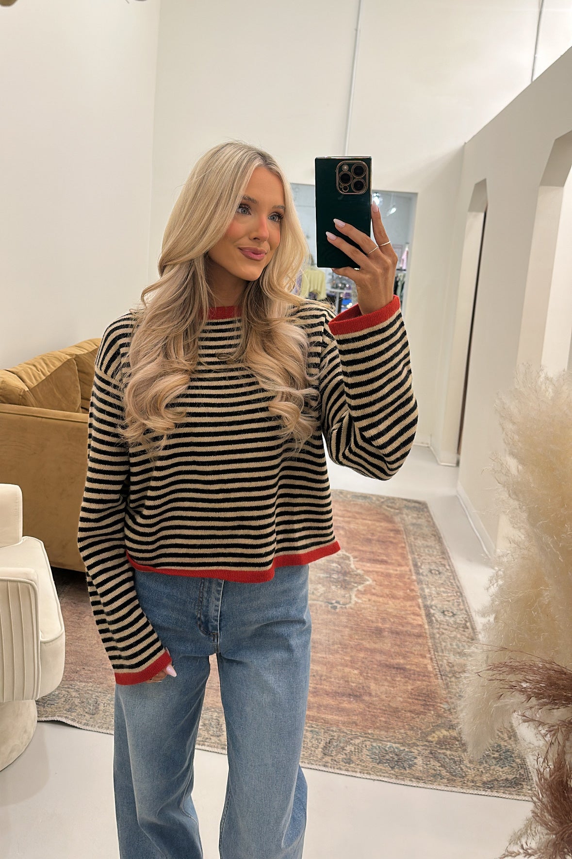ran and black striped sweater featuring a red outline at the neckline and hem