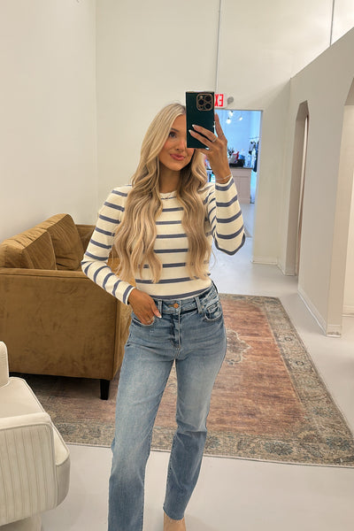 blue and white striped knit bodysuit