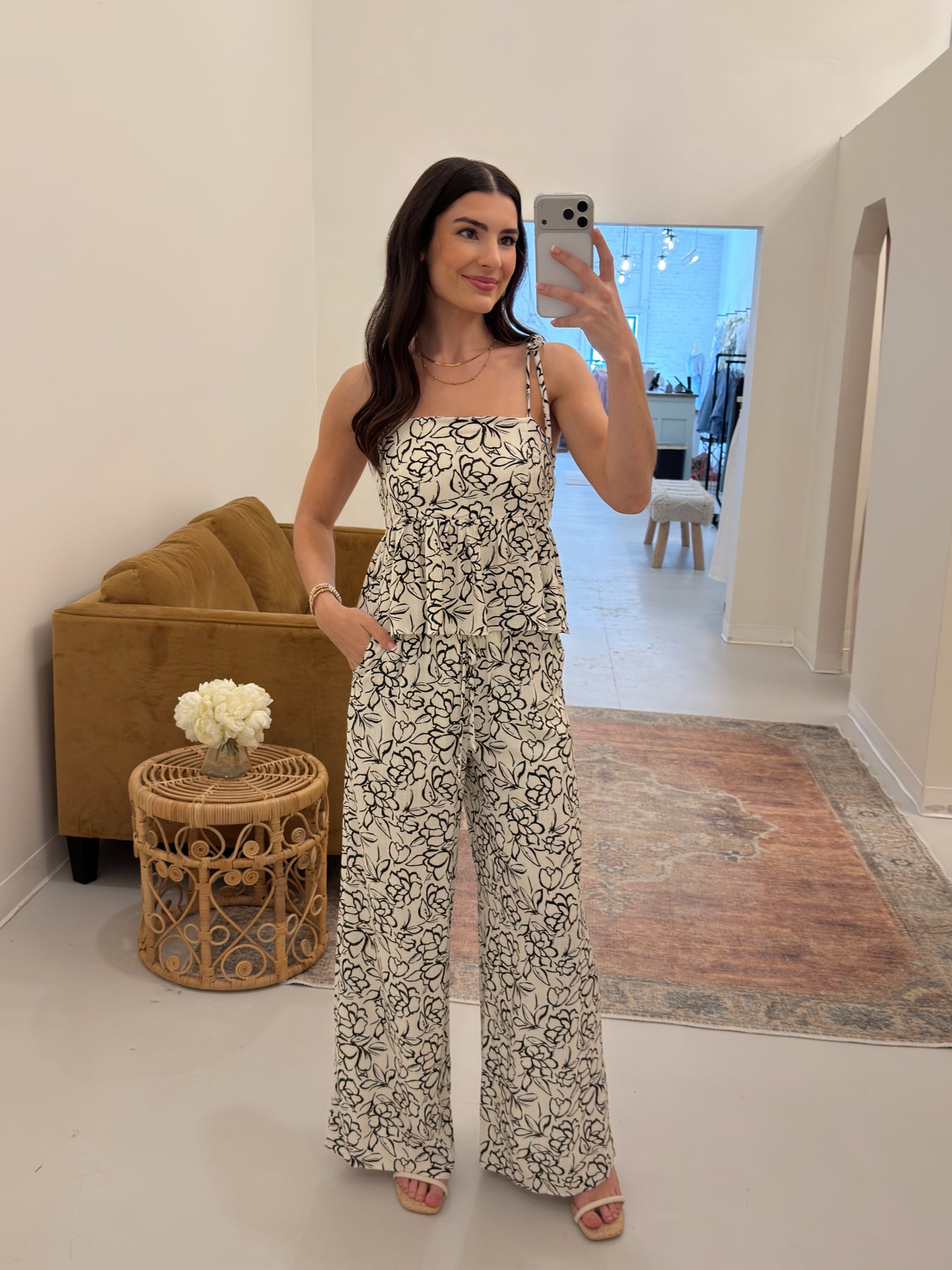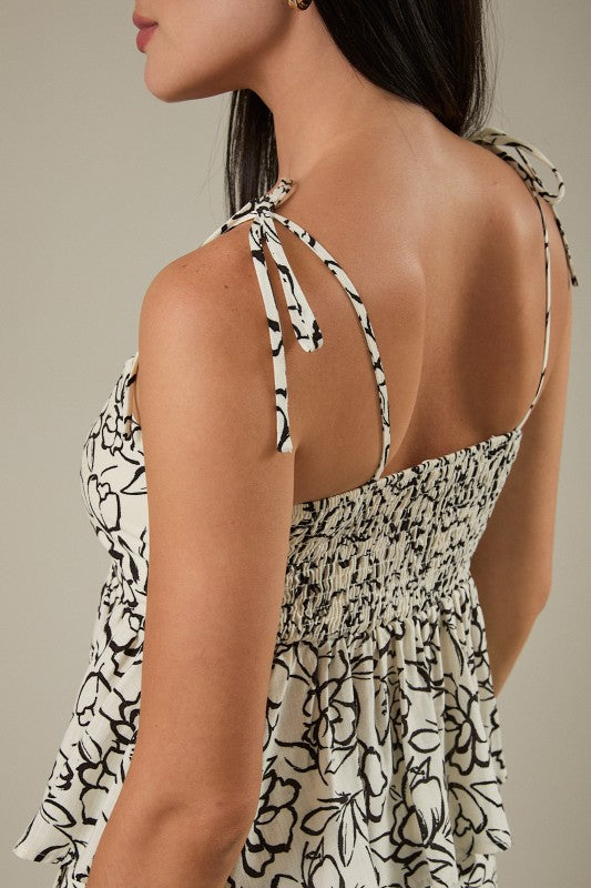 Spaghetti Tie Shoulder Strap Peplum Top - Ivory-Black Floral