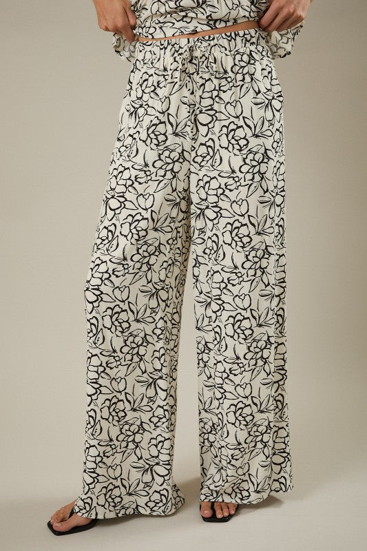 High Waist Draw String Elastic Wide Pants - Ivory-Black Floral